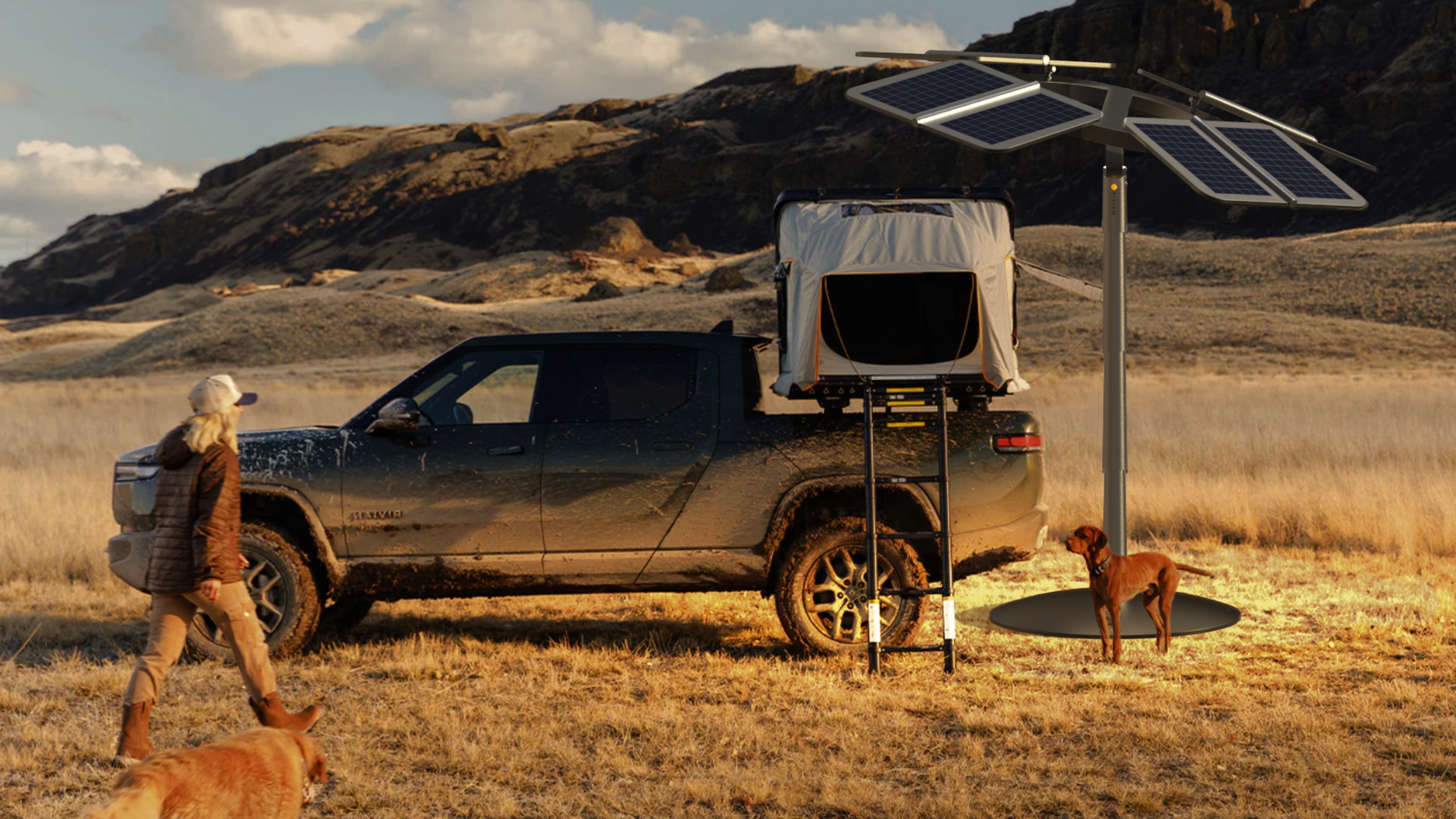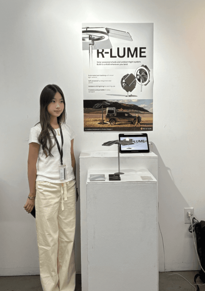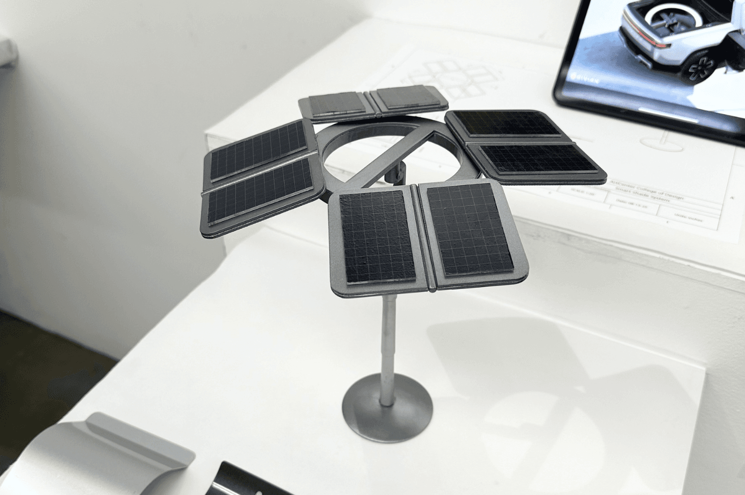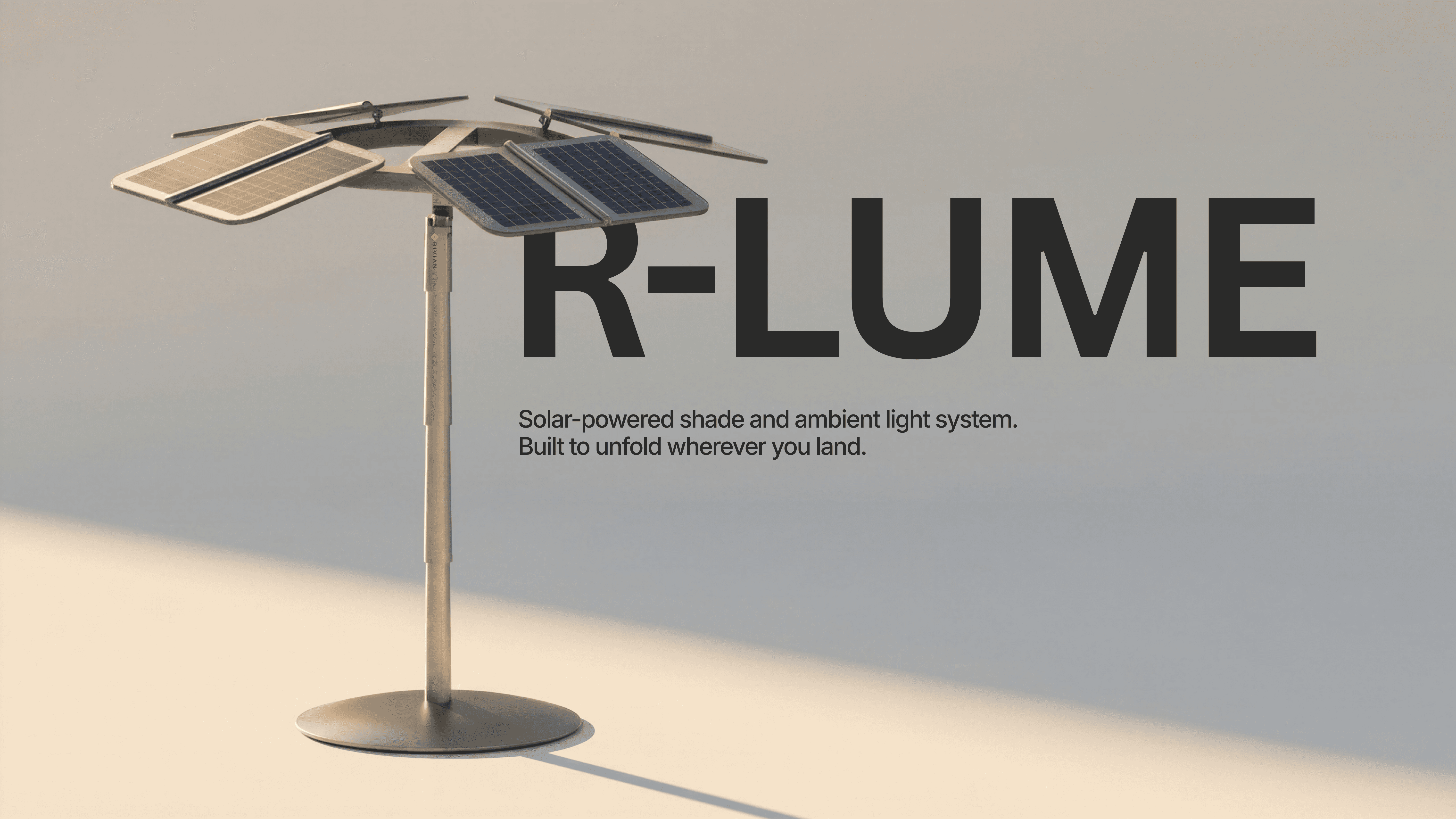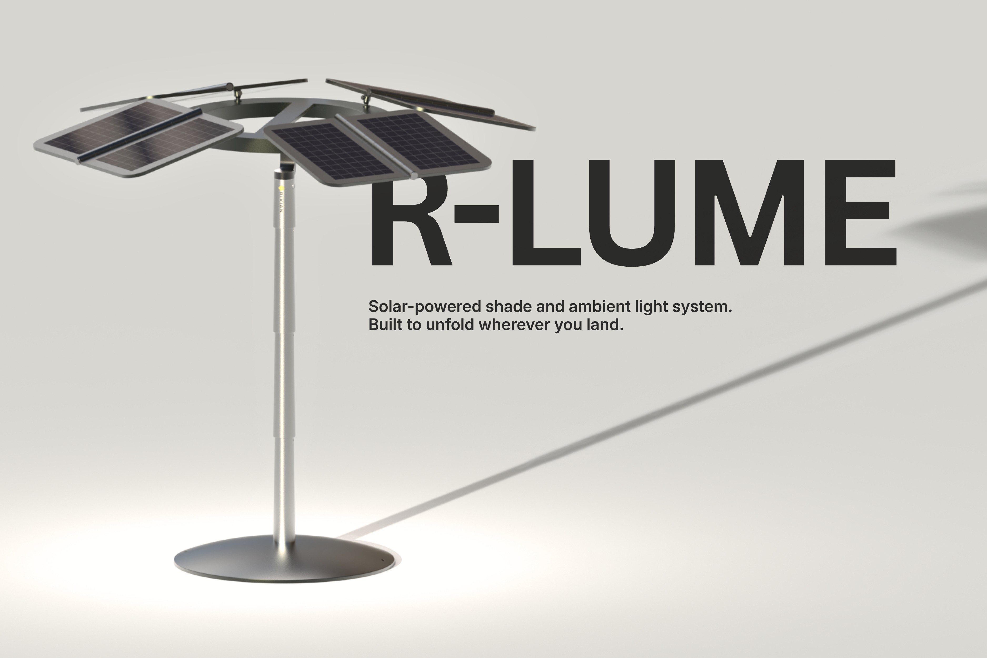 R‑LUME was developed in response to the design brief: create a product that enhances the Rivian Experience Center. The result is a foldable, solar-powered system that provides both shade and ambient lighting. It passively tracks the sun throughout the day to offer optimal coverage, while integrated solar panels store energy to softly illuminate the space at night.